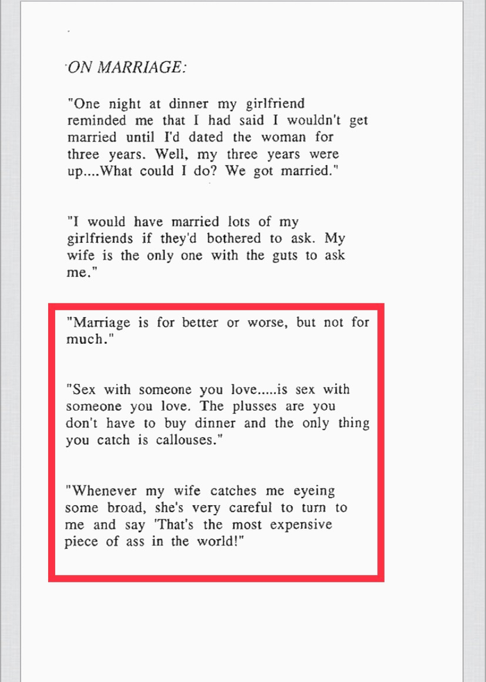 This booklet was given to Mike Bloomberg on his 48th birthday in 1990. It was produced by Elisabeth DeMarse, Bloomberg L.P.’s former chief marketing officer. “Yes, these are all actual quotes,” DeMarse wrote in the introduction. “No, nothing has been embellished or exaggerated. And yes, some things were too outrageous to include.” Bloomberg has given varying responses over the years when asked about some of the quotes in the booklet. His spokesman said in 2001 that “some of the things he might have said” and Bloomberg apologized to “anyone that was offended by” the comments. Bloomberg at one point referred to them as “a bunch of Borscht Belt jokes.” After The Post informed the Bloomberg campaign that it planned to put online a copy of the full booklet, spokesman Stu Loeser said, “Mike simply did not say the things somebody wrote in this gag gift, which has been circulating for 30 years and has been quoted in every previous election Mike has been in.” At the same time, Loeser added, “Mike openly admits that his words have not always aligned with his values and the way he has led his life and some of what he has said is disrespectful and wrong.” He did not provide specifics.
