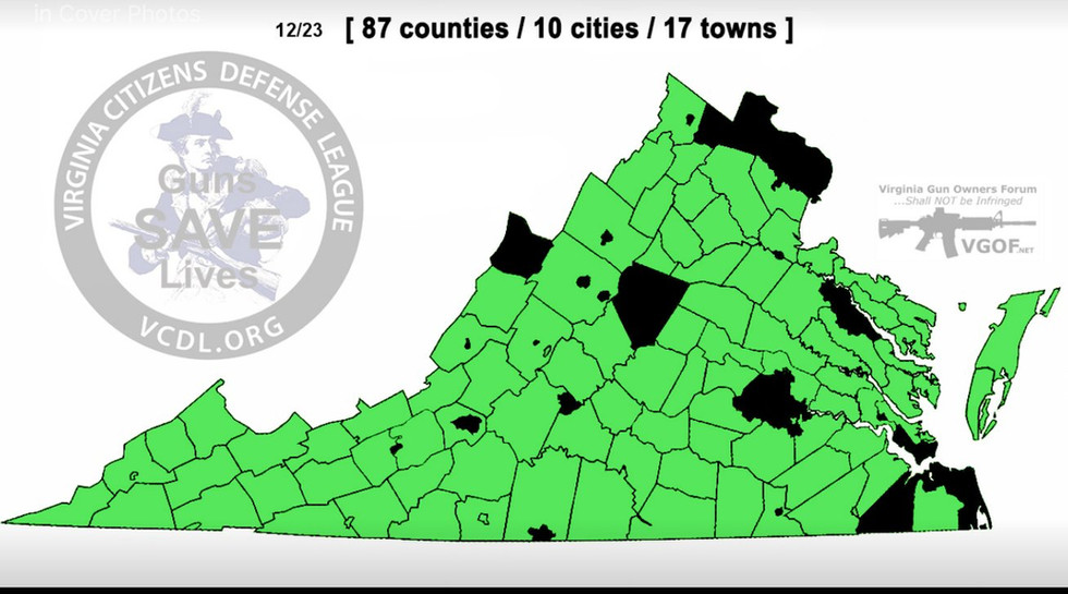 The Commonwealth of Virginia is comprised of 95 counties and 38 independent cities. The first image is the overall listing of the state of Virginia, with the counties and cities labeled. The bottom image: each bit of green is a 2A Sanctuary County or City. The black are counties/ cities that have either denied the 2A status or waiting to vote on 2A resolutions.